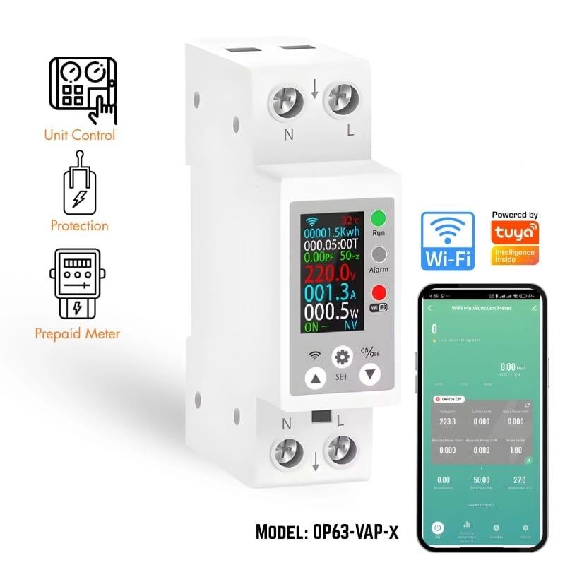Smart Unit Control Breaker & Prepaid System (OP63-VAP-X) – 63A WiFi Protection MCB, Temperature Sensor, Digital kWh Unit Lock, Color LCD Energy Monitor for Renters & Solar Homes