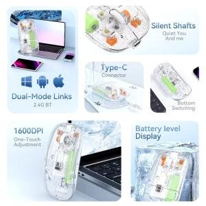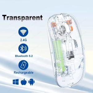 Transparent Dual-Mode Wireless Mouse – Bluetooth 5.2 + 2.4G Wireless, Silent Click, 3-Level DPI & Real-Time Battery Display