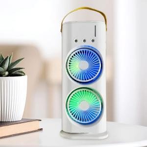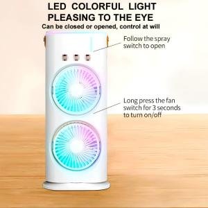 3-in-1 Dual Head Rechargeable Spray Cooling Fan – 2000mAh Battery, 90° Auto-Rotation, 3-Mode Mist Spray with RGB LED Lights & Remote Control